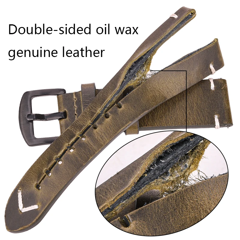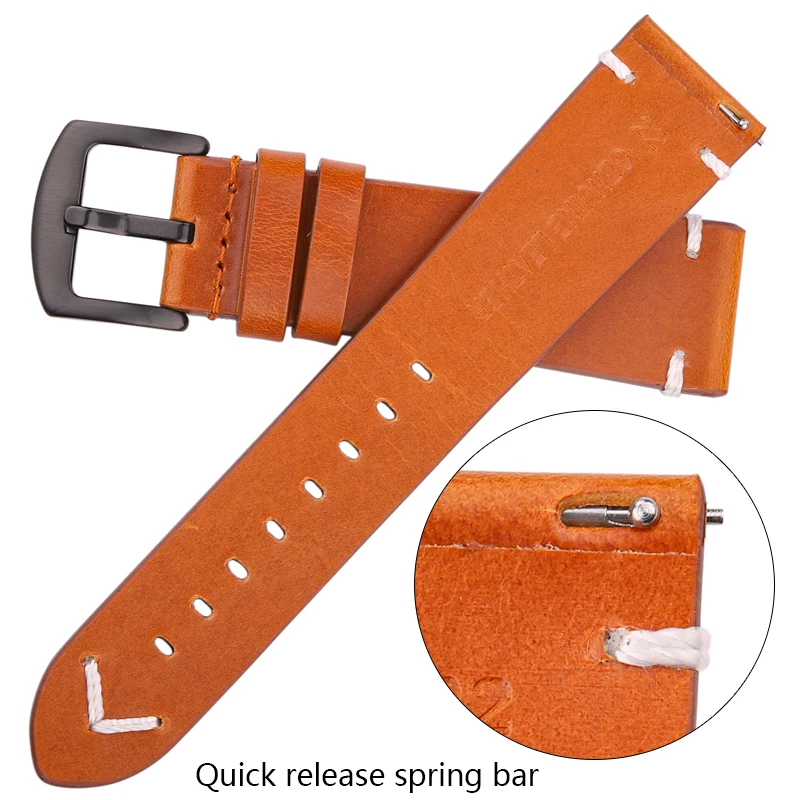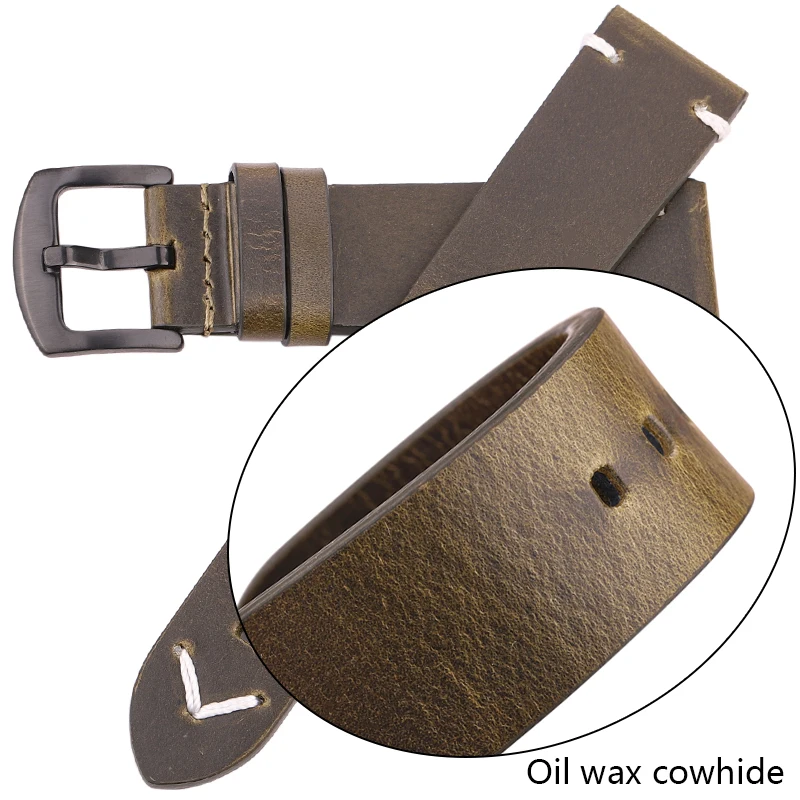 Crafted from high-quality genuine leather, this oil wax leather watch band offers durability and a premium feel. Clean and taut lines and classic vintage design are the main features that attract the attention of customers. It should also be said that replacing this watch strap is very easy because it has quick-release spring bars. The pin buckle is made out of stainless steel and comes in black and silver color, so everybody can pick a favorite. The simple design and elegant appearance of this oil wax leather watch band will definitely leave a good impression in every situation.